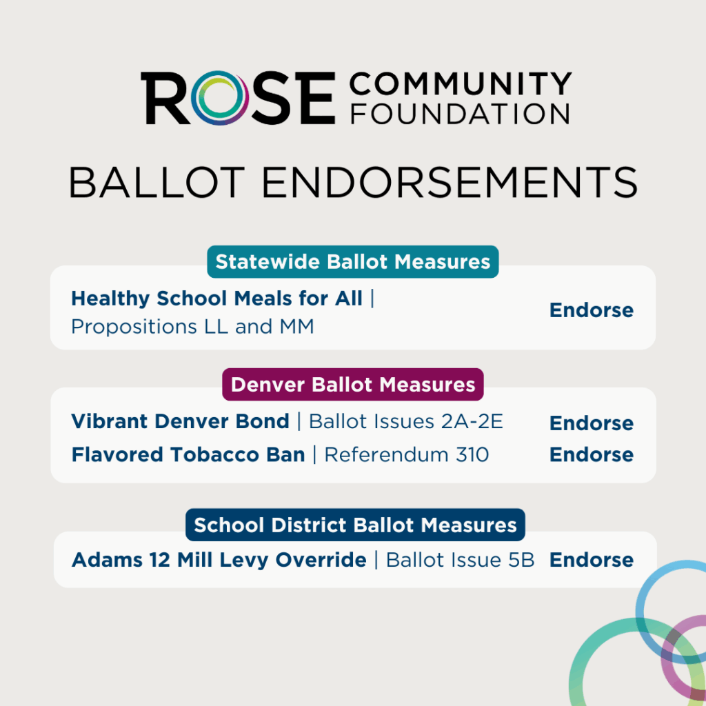 Even in this odd-numbered election year, Rose Community Foundation maintains consistent engagement with local policy issues. Rooted in our core values and our commitment to building a more just and inclusive Greater Denver, the Foundation has endorsed statewide, city and school-district ballot measures that promote health and wellness while investing in the strength of our schools and community infrastructure.